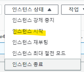 인스턴스 상태를 클릭하여 "인스턴스 시작" 버튼을 눌러줍니다.