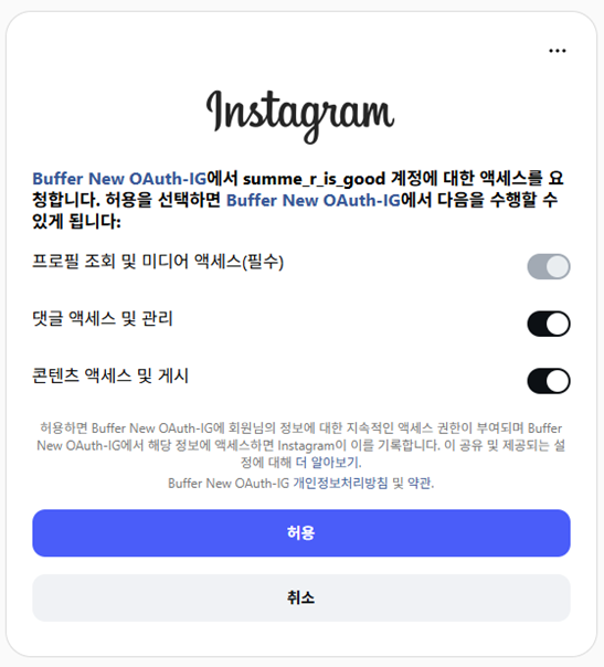 허용이 가능하도록 인스타그램을 로그인해줍니다.