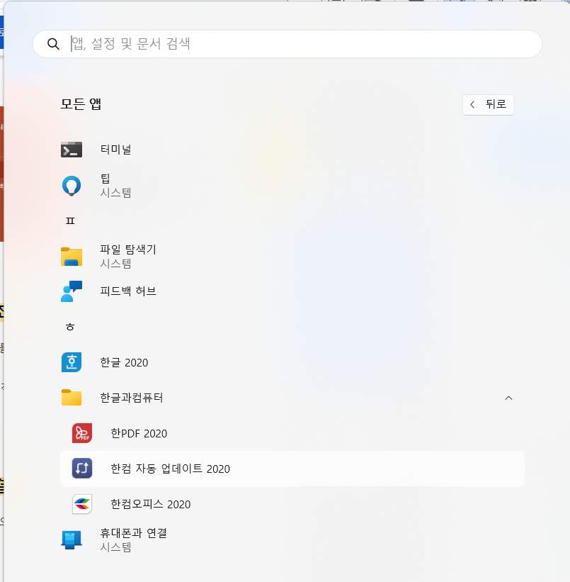1) 시작 > 모든앱 > 한글과컴퓨터 > 한컴 자동업데이트 2020