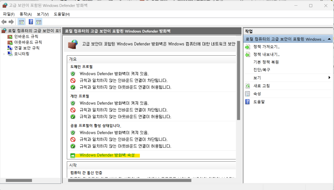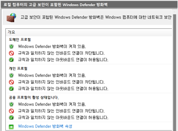 3) 개요의 도메인/개인/공용 프로필의 방화벽 하단 > Windows Defender 방화벽 속성 클릭