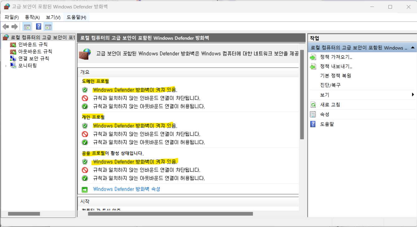 3) 개요의 도메인/개인/공용 프로필의 방화벽이 켜져있는지 확인