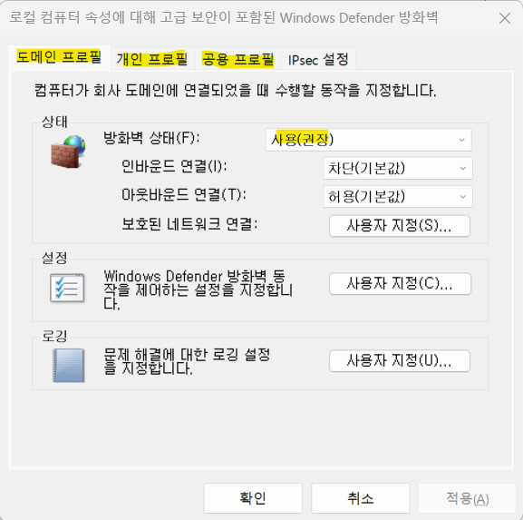 도메인 프로필 : 컴퓨터가 회사 도메인에 연결되어있을 때 수행할 동작을 지정합니다.