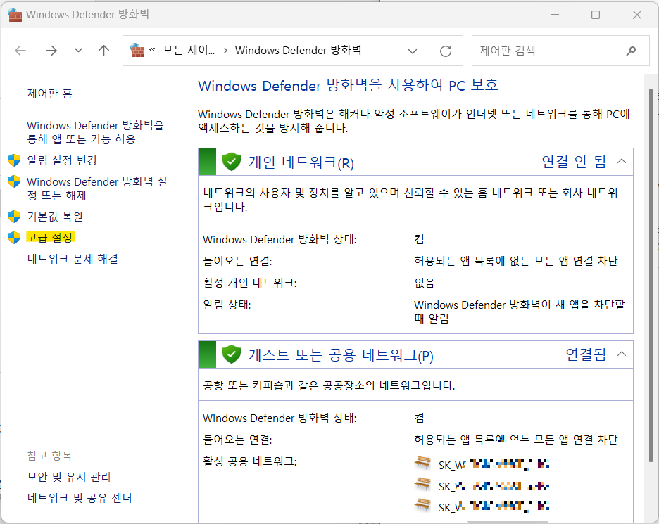 개인 프로필 : 컴퓨터가 개인 네트워크 위치에 연결되어있을 때 수행할 동작을 지정합니다.