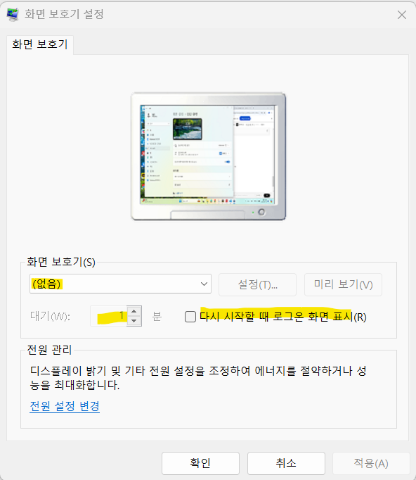 2) 다시 시작할 때 로그온 화면 표시 클릭 및 대기 시간 (10분 미만) 설정