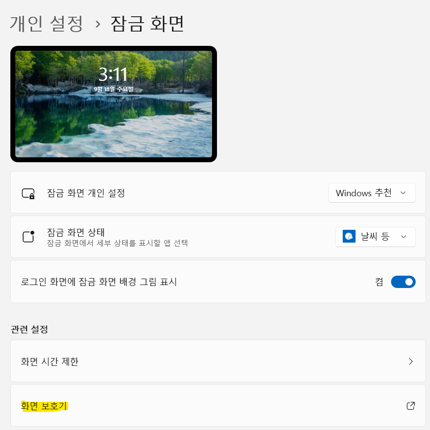 1) 바탕화면> 마우스 우클릭> 개인설정> 잠금화면> 화면보호기 클릭