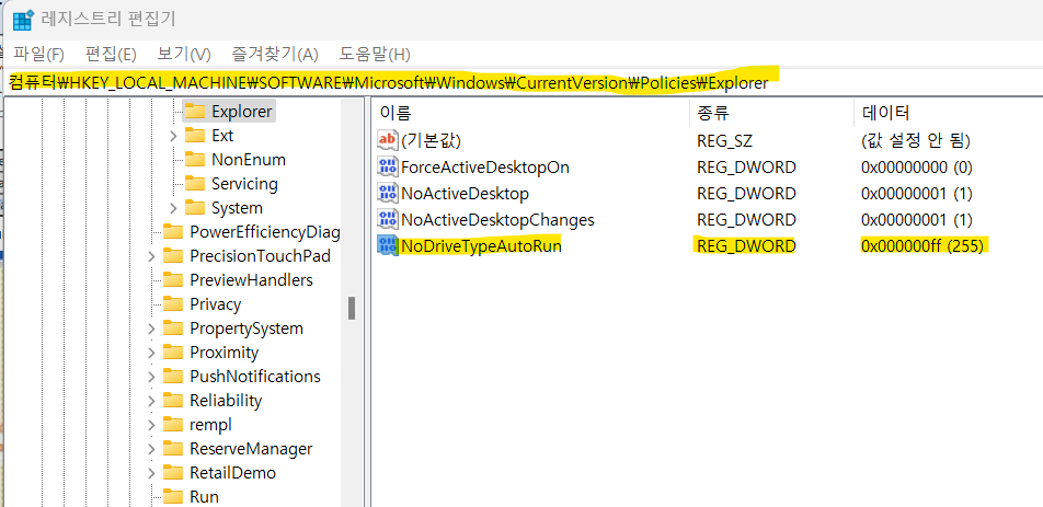 점검목적 : CD/DVD, USB 메모리 등과 같은 이동식 미디어를 USB port에 연결 시 자동 실행을 차단하도록 함