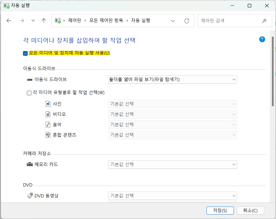 지금은 모든 미디어 및 장치에 자동 실행 되도록 설정되어있습니다.