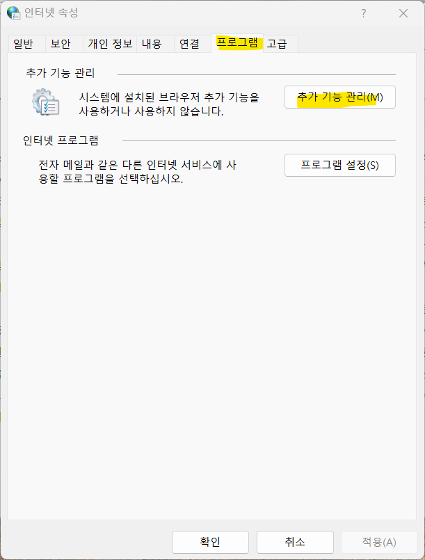 1) 제어판> 인터넷 옵션> 프로그램 > 추가 기능 관리> 삭제할 ActiveX 접근 > 불필요한 ActiveX 삭제