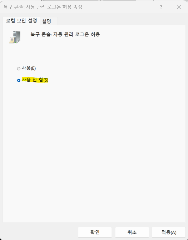 2) 복구 콘솔 : 자동 관리 로그온 허용 속성 : “사용 안 함” 설정