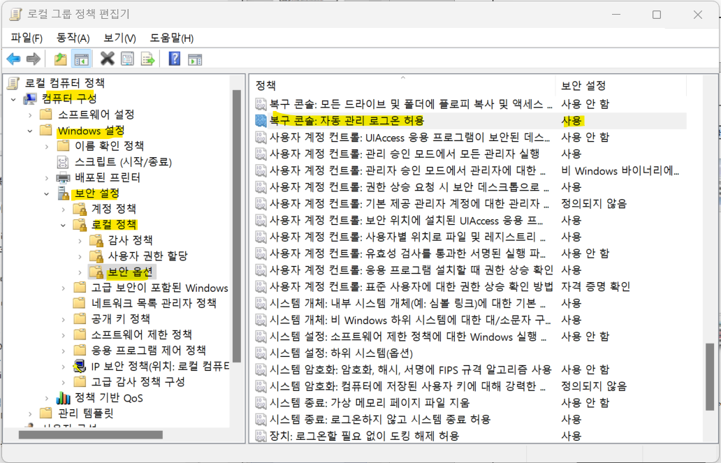 ▶ 조치방법 : 복구 콘솔 자동 로그온 허용 “사용 안 함”으로 설정