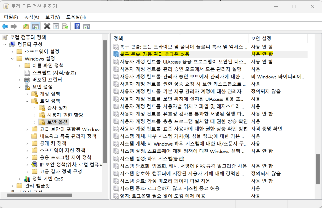 점검목적 : 복구 콘솔 자동 로그온 허용을 “사용 안 함“으로 설정함으로써 비인가자의 복구 콘솔을 통한 관리자 권한 탈취 등의 위험을 방지하기 위함