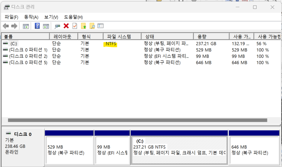 1) 시작> 실행> “diskmgmt.msc” 입력> 디스크 관리