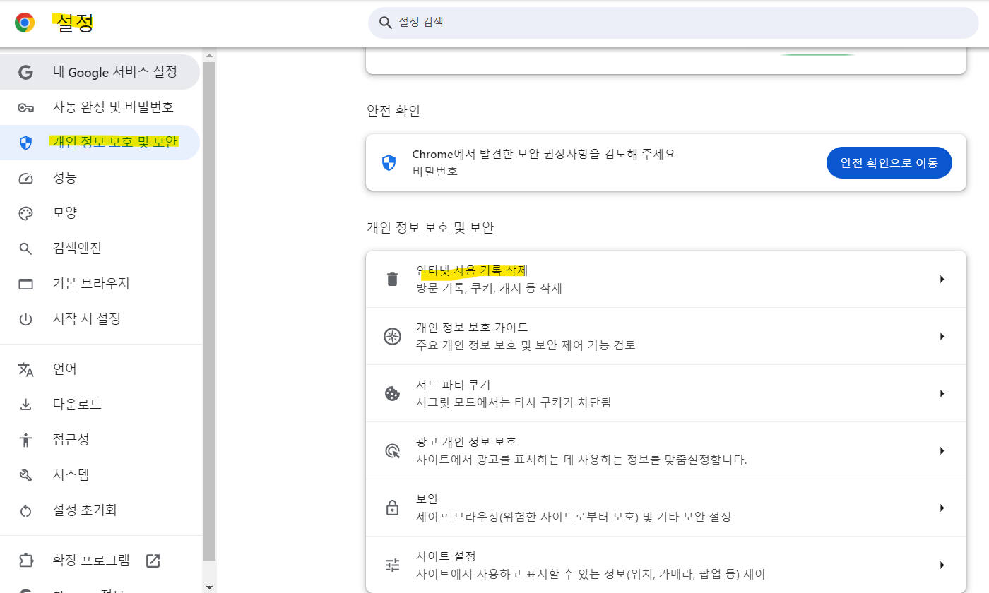 ▶ 점검목적 : 브라우저 사용 시 생성되는 임시 인터넷 파일 삭제를 통하여 웹 양식에 입력한 정보(예: 이름 및 주소), 자동 로그인을 위한 웹 사이트 암호 정보 등을 삭제하여 개인정보의 보안을 향상시키기 위함