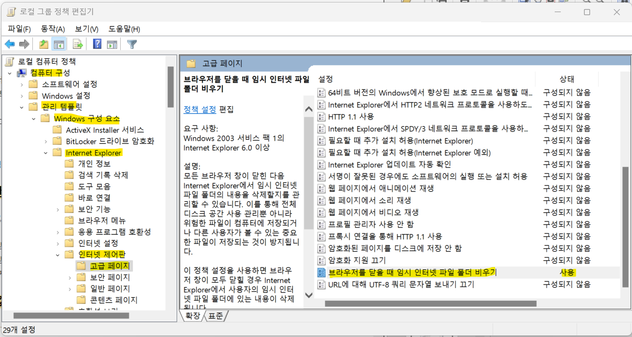 2) “브라우저를 닫을 때 임시 인터넷 파일 폴더 비우기” -> 속성 : “사용”