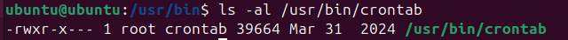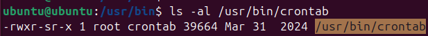 -rwxr-x--- 1 root crontab 39664 Mar 31 2024 /usr/bin/crontab
