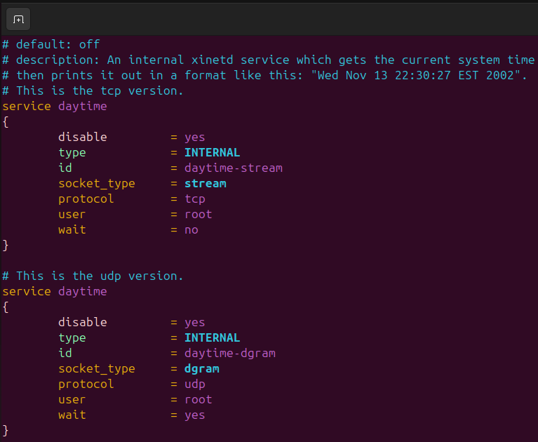 ubuntu@ubuntu:~$ sudo vi /etc/xinetd.d/daytime