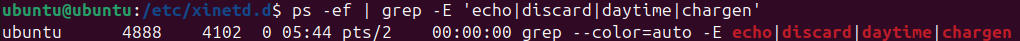 ubuntu 4888 4102 0 05:44 pts/2 00:00:00 grep --color=auto -E echo|discard|daytime|chargen