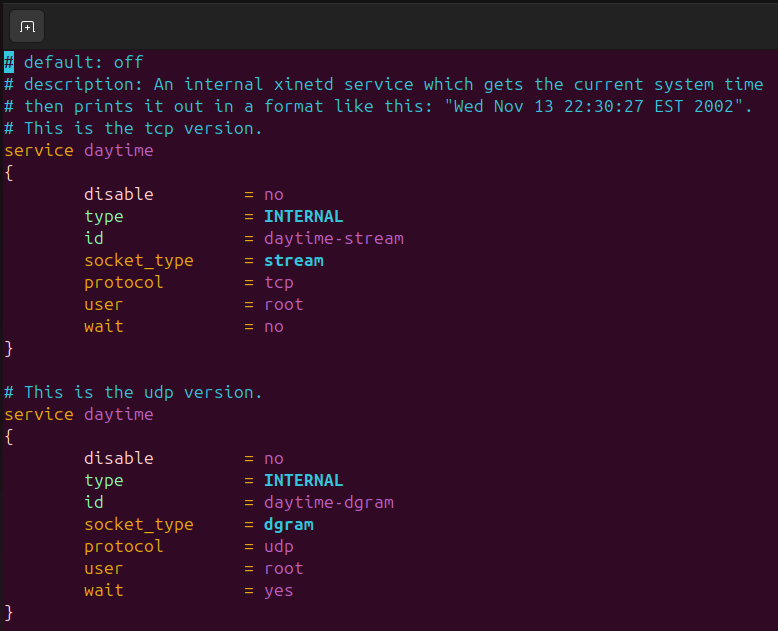 ubuntu@ubuntu:~$ sudo vi /etc/xinetd.d/daytime