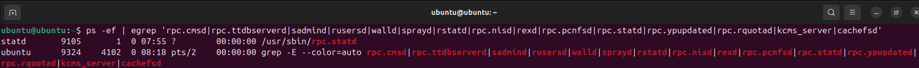 ubuntu@ubuntu:~$ ps -ef | egrep 'rpc.cmsd|rpc.ttdbserverd|sadmind|rusersd|walld|sprayd|rstatd|rpc.nisd|rexd|rpc.pcnfsd|rpc.statd|rpc.ypupdated|rpc.rquotad|kcms_server|cachefsd'