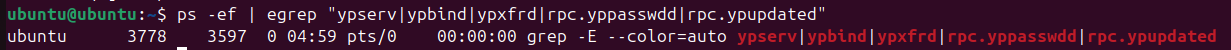 ubuntu 3736 3597 0 04:50 pts/0 00:00:00 grep -E --color=auto ypserv|ypbind|ypxfrd|rpc.yppasswdd|rpc.ypupdated