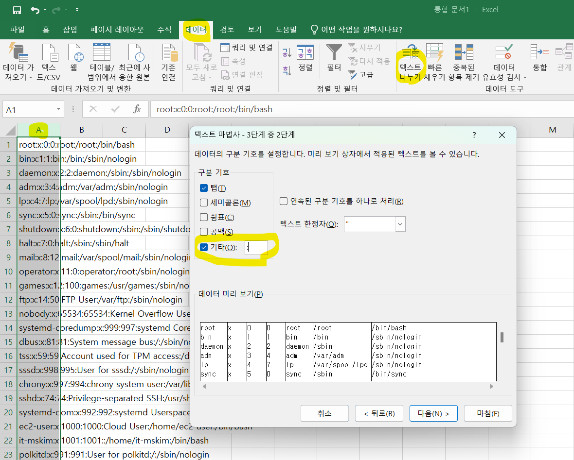 A열 선택 -> 데이터 -> 텍스트 나누기 -> 데이터 구분기호 "기타 :" -> 다음-> 마침